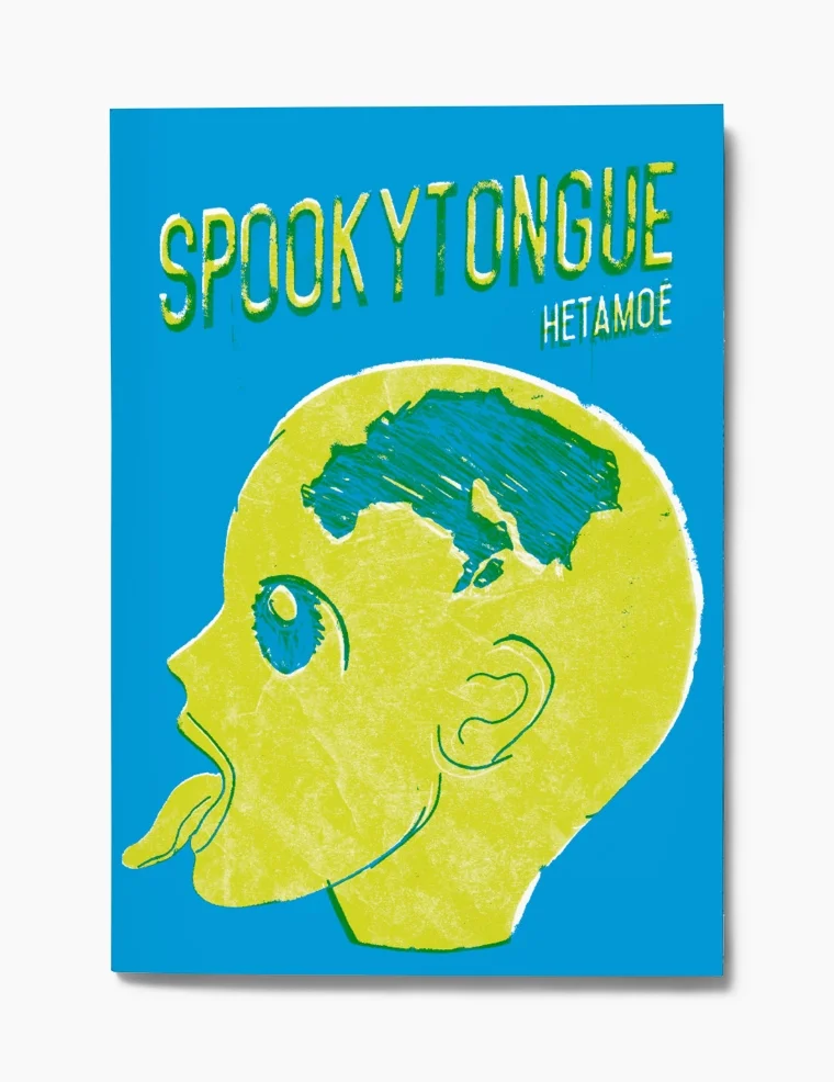 Spookytongue é uma banda desenhada de ficção científica existencialista em dois actos, explorando topografias corporais da emoção através da pseudociência abjecta do misticismo quântico. A primeira metade é uma drabble visual narrada do ponto de vista de um ser humano fabricado biogeneticamente para recolher informação sobre mundos paralelos, à medida que o seu sentimento de identidade própria se torna cada vez mais fragmentado e desterritorializado. A segunda metade, composta por comic strips em formato yonkoma ("quatro painéis"), é uma tentativa de mapear fluxos inter-fronteiriços, fazendo colapsar charlatanismo quântico, gravure idols japonesas, ensinamentos budistas, tectónicas futuras e imagens militares num omake distendido de poesia antropocénica. Hetamoé baseia-se em influências como a (anti-)ficção científica onírica de Tarkovsky, Blade Runner: The Final Cut (dica: o unicórnio!), misticismo New Age de pacotilha e a sua adorada dashboard do Tumblr para tecer esta experiência esquizoide em aprazíveis tons de amarelo e azul. Acusado por alguns de ser "propaganda trans-humanista fascista”, cabe agora a cada leitor dar o seu veredito final sobre Spookytongue.